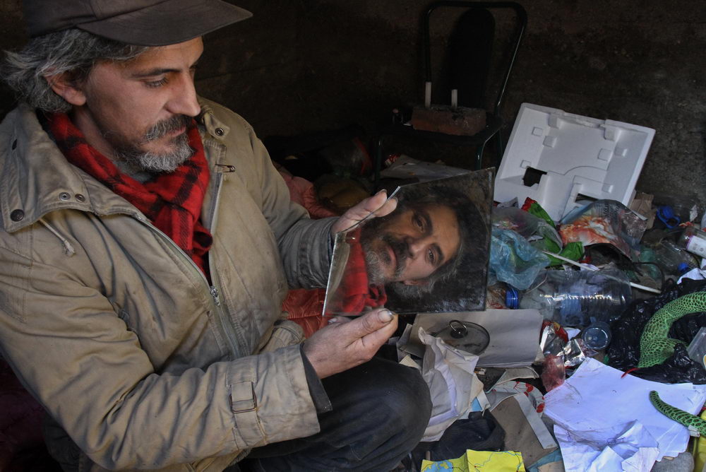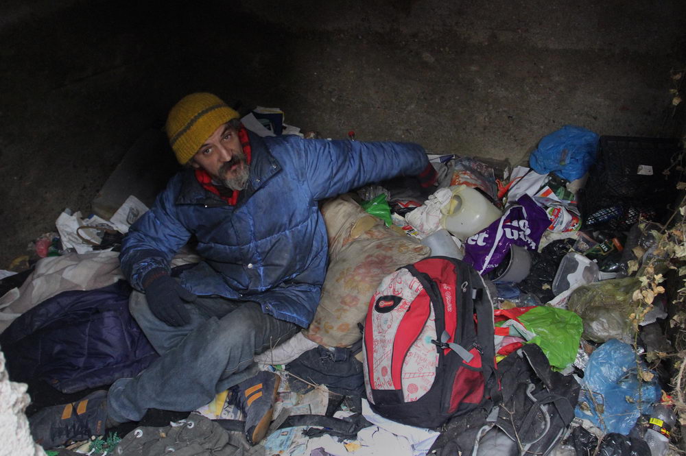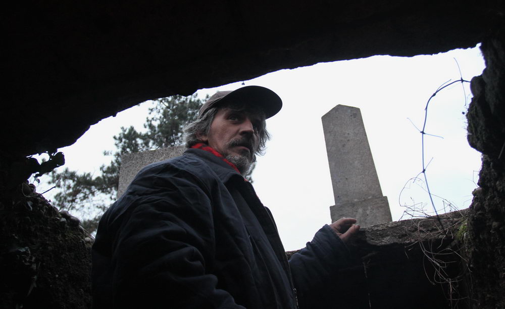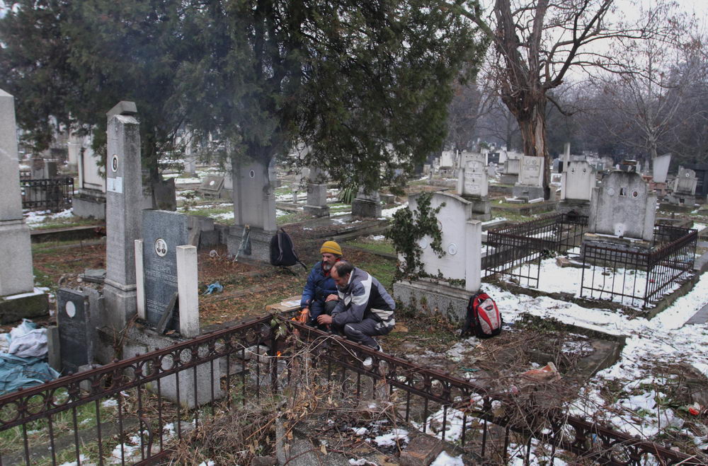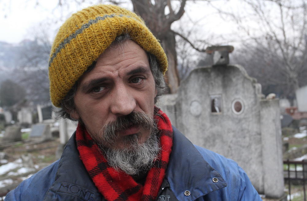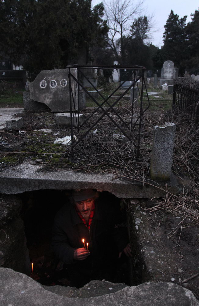 Neobrijan sa dve kape na glavi, vunenom i kačketom, u ne mnogo zaprljanoj jakni koja je nekada bila zelene boje, sa crvenim šalom, u džinsu i patikama na nogama, Bratislav nam pokazuje kako ulazi u grobnicu i pokriva se starim jorganom. Kaže da se u ozidanoj betonskoj grobnici nalaze tri metalna kovčega, ali da ih je pokrio da ih ne gleda.