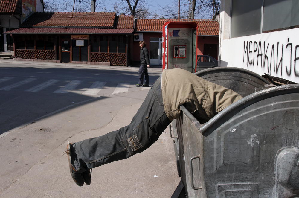 Bratislav puši cigarete koje sam mota. Duvan vadi iz plastične kese, a umesto rizle koristi otkucanu rolnu fiskalnih računa koje je našao.Kutiju cigareta koju mu nudimo brzo stavlja u džep.