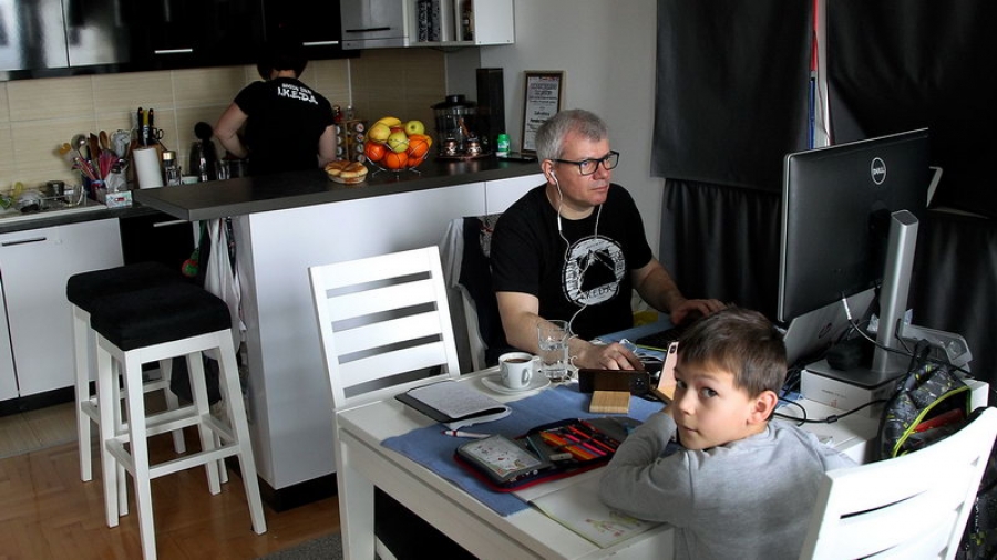 U stanu porodice Strahinić iz Niša radna atmosfera. Iz različitih prostorija dopiru samo zvuci tipkanja po tastaturi. Strahinići su svoj životni prostor pretvorili u radni, pa od kuće onlajn rade i roditelji i deca.