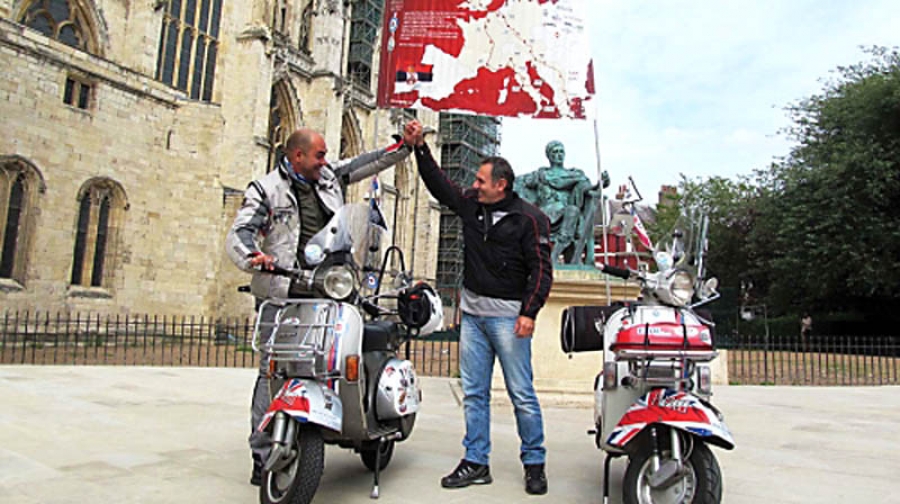 Vožnja vespom ulicama večnog grada Rima ali i impozantni spomenik caru Konstantinu u Jorku najači su utisci dvojice Nišlija, Dejana Tonića i Aleksandara Đorđevića, sa tronedeljnog putovanja Evropom tokom kojeg su, na svojim vespama iz osamdesetih godina, posetili najznačajnije gradove vezena za ime Konstantina Velikog.