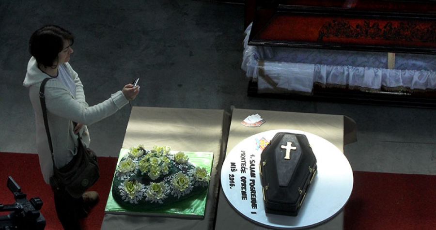 Vaše je samo da umrete , sve ostalo je naša briga - slogan je, kažu, privatnika koji organizuje sahrane i prevozi pokojnike. Davno je već marketing ušao u pogrebna preduzeća, a sudeći po statistici koja tvrdi da nas sve više umire nego što se rađamo, tek će biti agresivniji ili bizarniji. Poput one torte u obliku kovčega, sa crnom glazurom na sajmu pogrebne opreme prošle godine u Nišu.