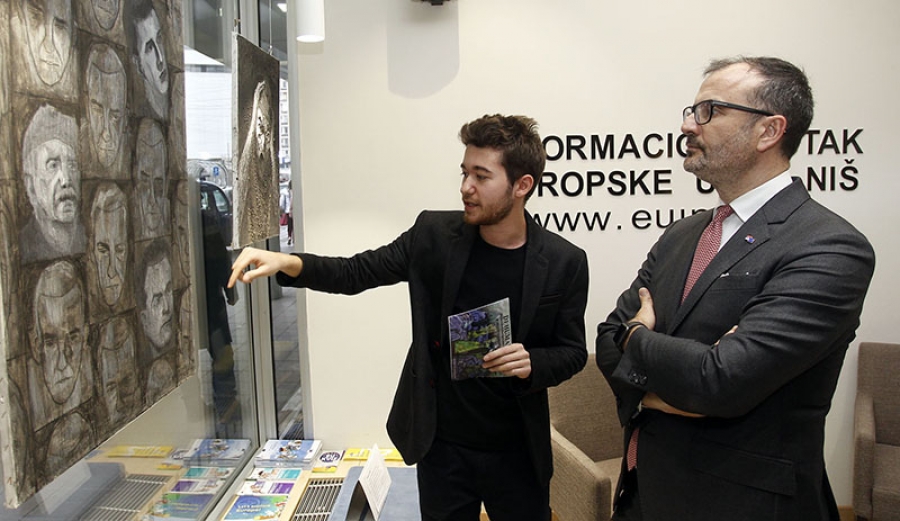 ,,Jako sam srećan što postoji EU info kutak u Nišu, što praktično imamo kancelariju u ovo gradu. Ovde se osećam kao kod kuće. Takođe, tokom posete Narodnom muzeju, kustos me je kroz 15 minuta proveo kroz čitavu istoriju ovog područja’’, istakao je šef Delegacije EU u Srbiji i podsetio da je 2018. Godina kulturnog nasleđa. Prisutnima se obratio i autor postavke ,,Dehumanizacija’’, otvorene povodom Međunarodnog dana sećanja na žrtve holokausta, Aleksandra Marković. ,,Želeo sam naglasak stavim na facijalne ekspresije i govor tela, da ljudi koji pogledaju ove slike mogu da se identifikuju sa onim kroz šta su žrtve holokausta prošle’’, objasnio je Marković kome je postavka u EU info kutku prva samostalna izložba.